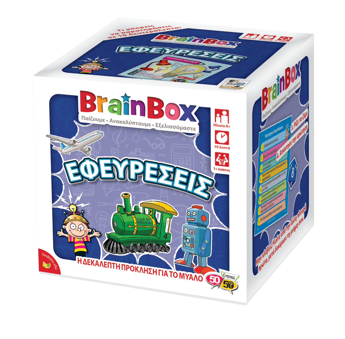 Γνώρισε τις πιο σημαντικές ή και παράξενες εφευρέσεις! Διάλεξε μια κάρτα μέσα από το BrainBox. Αναποδογύρισε την κλεψύδρα και προσπάθησε να μάθεις απ'έξω την κάρτα σε 10 δευτερόλεπτα! Τώρα ρίξε το ζάρι και απάντησε στην αντίστοιχη ερώτηση. Αν απαντήσεις σωστά κρατάς την κάρτα, αν απαντήσεις λάθος βάζεις την κάρτα πάλι μέσα στο BrainBox.
