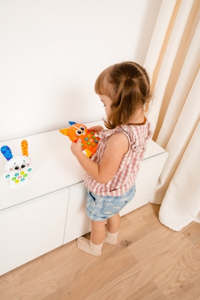 Με το Babies Μουσικό Ζωάκι Γατάκι το παιδί μαθαίνει την αλφάβητο και την αρίθμηση μέσα από διασκεδαστικές ασκήσεις. Οι αστείοι ήχοι και οι μελωδίες καλλιεργούν το ενδιαφέρον του για τη μουσική και το ενθαρρύνουν να τραγουδήσει και να χορέψει στο άκουσμα χαρούμενων τραγουδιών. Μια μεγάλη μουσική περιπέτεια ξεκινά! Διατίθεται σε τρία σχέδια: κουτάβι, γατάκι και λαγουδάκι.