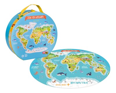 Ένα πρωτότυπο παζλ χάρτης που απεικονίζει τα ζώα ολόκληρου του κόσμου. Από τη Βόρεια Αμερική μέχρι την παγωμένη Ανταρκτική θα δεις και θα γνωρίζεις τα ζώα που κατοικούν στα πέρατα της γης συναρμολογώντας αυτό το παζλ 100 κομματιών της σειράς «50/50 GAMES».