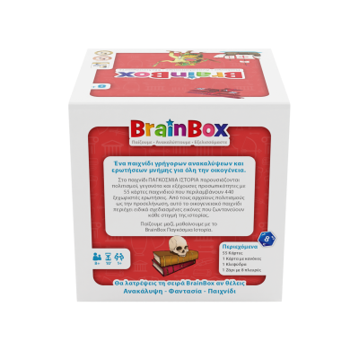 Μάθε για τα πιο συναρπαστικά γεγονότα της παγκόσμιας ιστορίας! Διάλεξε μια κάρτα μέσα από το BrainBox. Αναποδογύρισε την κλεψύδρα και προσπάθησε να μάθεις απ'έξω την κάρτα σε 10 δευτερόλεπτα! Τώρα ρίξε το ζάρι και απάντησε στην αντίστοιχη ερώτηση. Αν απαντήσεις σωστά κρατάς την κάρτα, αν απαντήσεις λάθος βάζεις την κάρτα πάλι μέσα στο BrainBox.