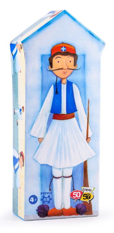 Το παζλ είναι εμπνευσμένο από την ελληνική ιστορία και απεικονίζει έναν Τσολιά και μια Αμαλία! Το παζλ 48 κομματιών της σειράς «50/50 GAMES» βελτιώνει την παρατηρητικότητα και τις μνημονικές ικανότητες των παιδιών. Βοηθά τον συντονισμό χεριών και ματιών, την αναγνώριση σχημάτων και τις κινητικές ικανότητες των παιδιών. Το παιχνίδι είναι σχεδιασμένο από Έλληνες εικονογράφους. Επιπλέον, για την κατασκευή του έχει χρησιμοποιηθεί χοντρό χαρτόνι καλής ποιότητας από ανακυκλωμένο χαρτόνι κατά 70% και είναι ανακυκλώσιμο. Τα κομμάτια του παζλ περιέχονται σε ένα πρωτότυπα σχηματισμένο κουτί με το όμορφο και εντυπωσιακό σχέδιο του Τσολιά. Επίσης, μπορείτε να χρησιμοποιήσετε το κουτί και ως αποθηκευτικό χώρο!